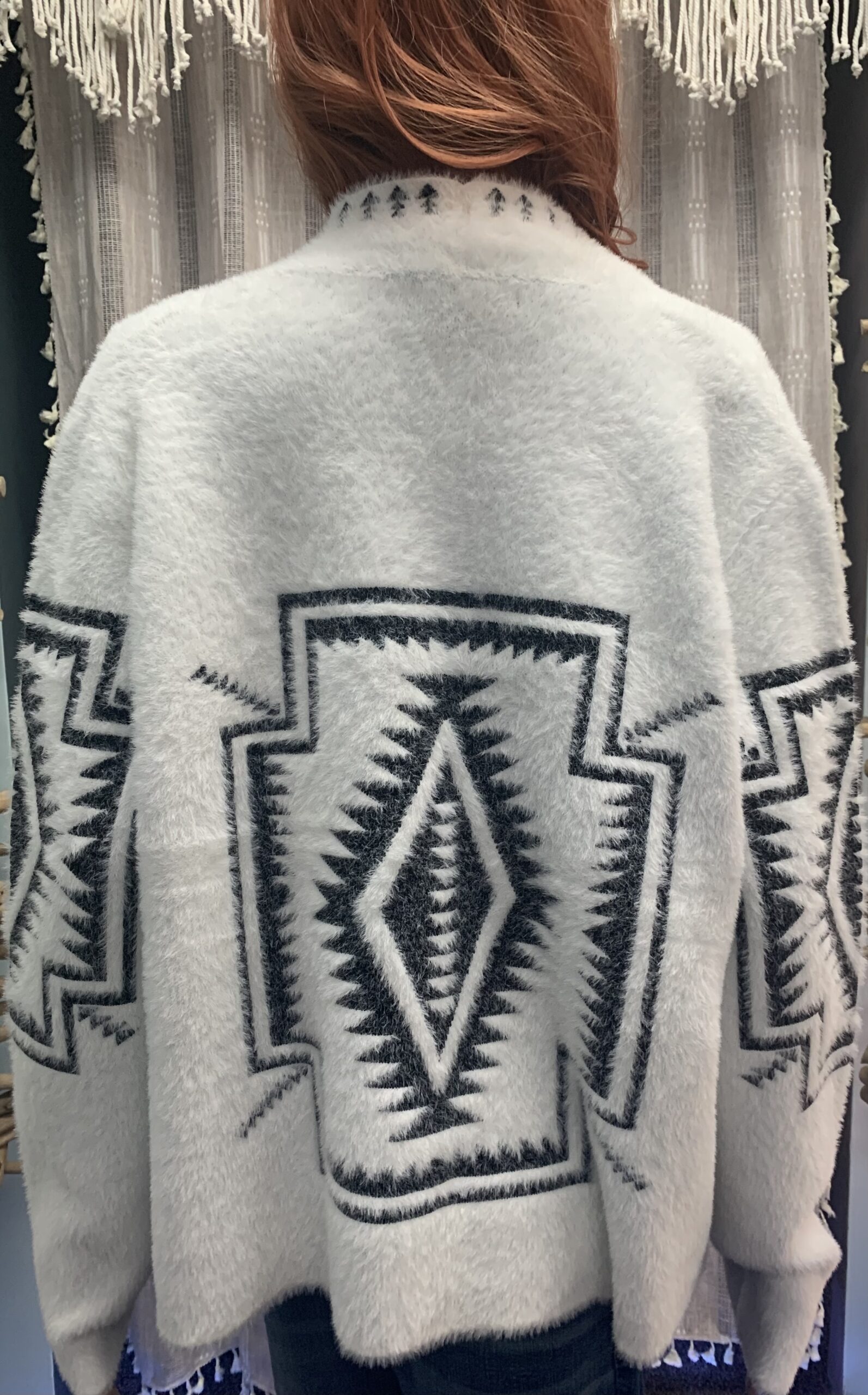 The Nelly Cardigan is proof that style doesn’t have to be long to make a lasting impression. Falling at the waistline, this piece delivers warmth, softness, and unmistakable beauty in a chic, versatile cut. Its bold southwestern-inspired motifs bring an edge of artistry, while the shorter length makes it an easy layer for everyday wear.